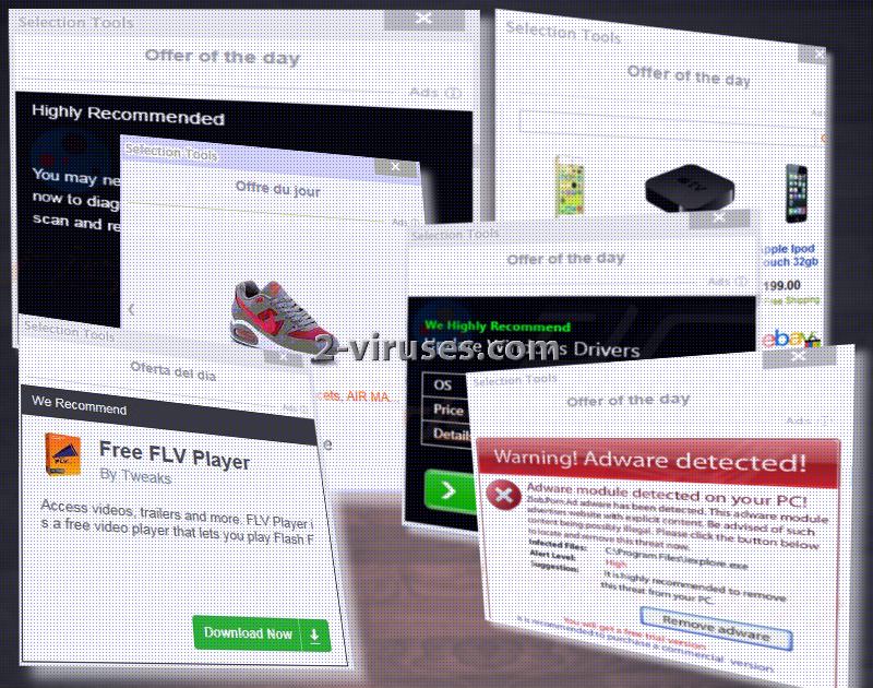 De Selection Tools adware is een toepassing die je veel commercieel materiaal toont. Het richt zich voornamelijk op het verdelen van reclame voor online winkel diensten, maar gebruikers klagen er ook over opgeschrikt te worden door beveiligingswaarschuwingen, die melden dat er zich virussen op hun apparaat bevinden. In theorie zouden gebruikers nuttige aanbiedingen kunnen tegenkomen. Selection Tools is echter niet de reclame leverende software die je zou mogen vertrouwen. Het programma stelt drie aanbiedingen per dag te tonen, maar we hebben het gevoel dat gebruikers blootgesteld werden aan veel meer aanbiedingen. Er wordt gezegd van Ads by Selection Tools dat ze relevant zijn en getoond worden in een venster (de grootte ervan is gelijk aan een normale banner).