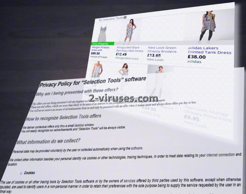 Selection Tools werd geclassificeerd als een advertentie ondersteunde toepassing die inkomsten ontvangt voor het verdelen van inhoud die verkopers en andere derden ter beschikking stellen. Volgens ons kunnen verschillende aanbiedingen getoond worden als Ads by Selection Tools. De inhoud varieert van kledij, schoenen, juwelen, elektrische appraten tot technische ondersteuning en andere veiligheidswaarschuwingen. Daarnaast hebben we gemerkt dat de toepassing pop-ups of banners zal aanbevelen of tonen als bron voor nieuwe software. Je zou reeds goed geïnformeerd moeten zijn over het downloaden van programma’s van op onbekende bronnen. Het is van vitaal belang te benadrukken dat het reageren op Ads by Selection Tools een gevaarlijke beslissing is. We hebben klachten ontvangen over deze toepassing als zou ze rogue materiaal introduceren dat of je wil infecteren met malware/potentieel ongewenste toepassingen, of je persoonlijke info wil stelen.